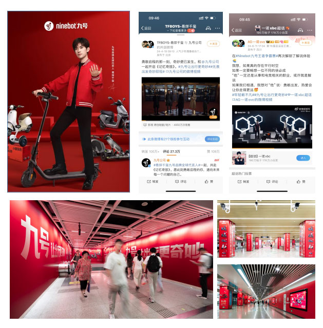 ● 易烊千玺的代言为九号电动车赋予了“潮流、科技、个性”的标签,九号联合易烊千玺推出微电影《记忆奇旅》等原创内容,在微博实现裂变式传播,微博的粉丝经济属性使九号能够直接触达易烊千玺的庞大粉丝群体,而微博与地铁媒体的投放则通过年轻用户熟悉的场景(如社交平台、通勤路途)传递品牌价值,成功破圈Z世代群体。